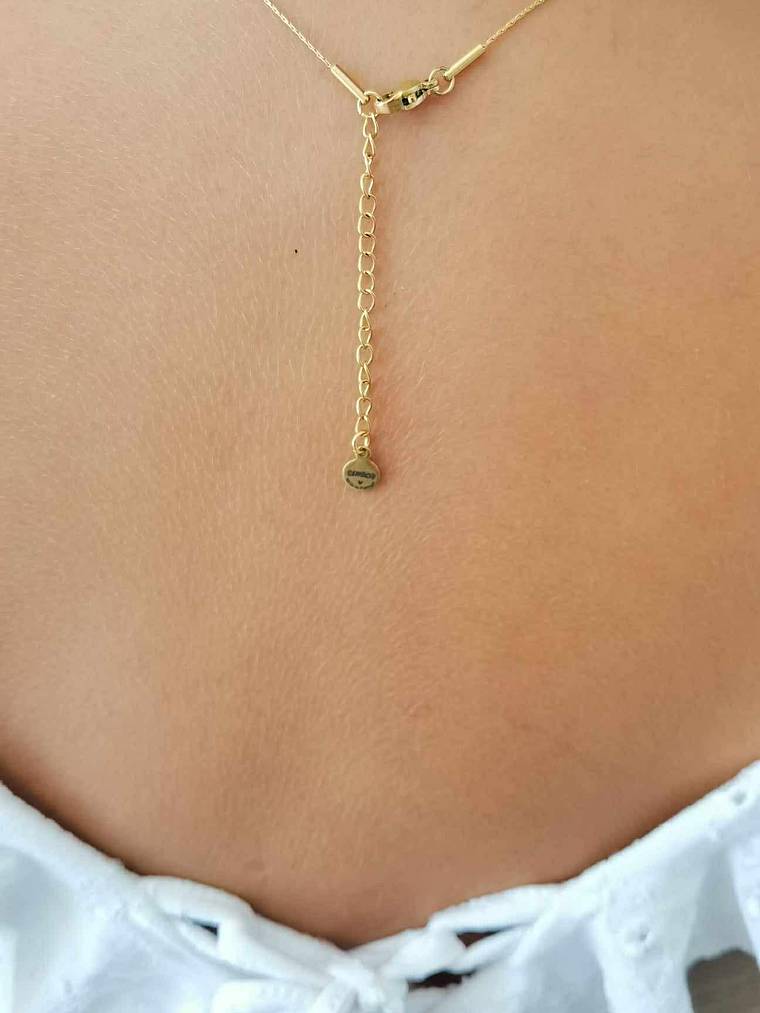 A corrente é em aço inoxidável de malha fina (0,7 mm), anti-alérgica e sem níquel, com extensão ajustável (40 cm + 10 cm) para um uso confortável e versátil.