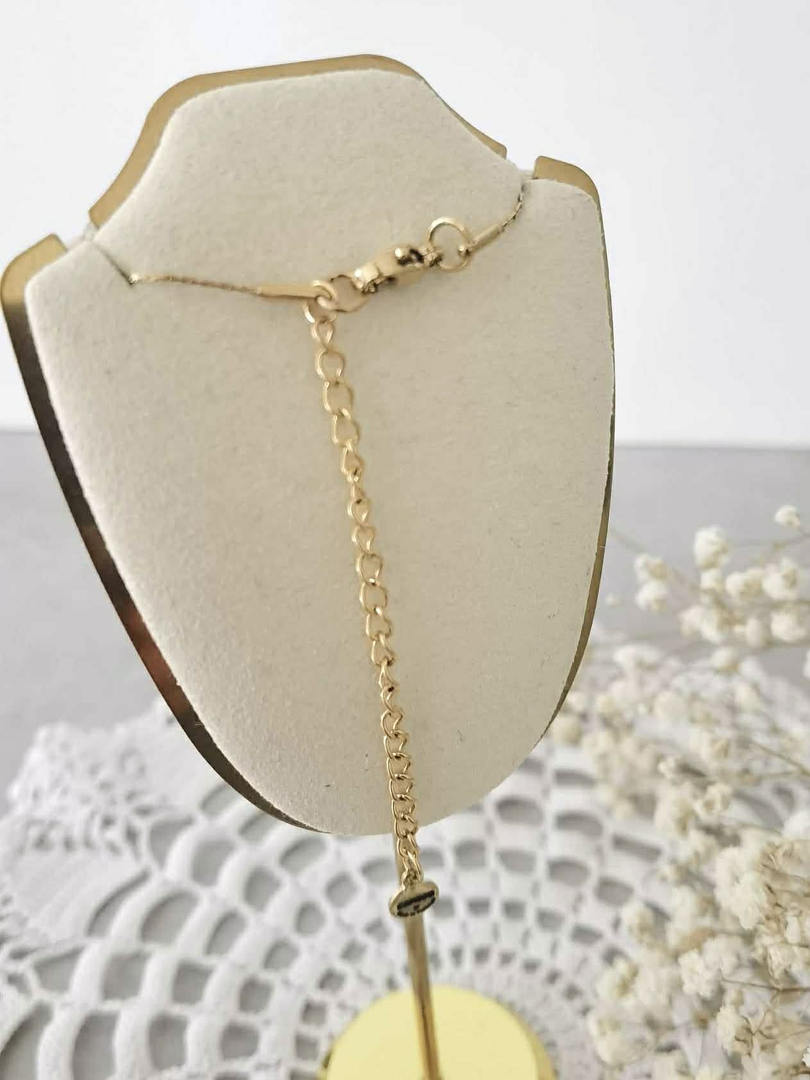A corrente é em aço inoxidável de malha fina (0,7 mm), anti-alérgica e sem níquel, com extensão ajustável (40 cm + 10 cm) para um uso confortável e versátil.