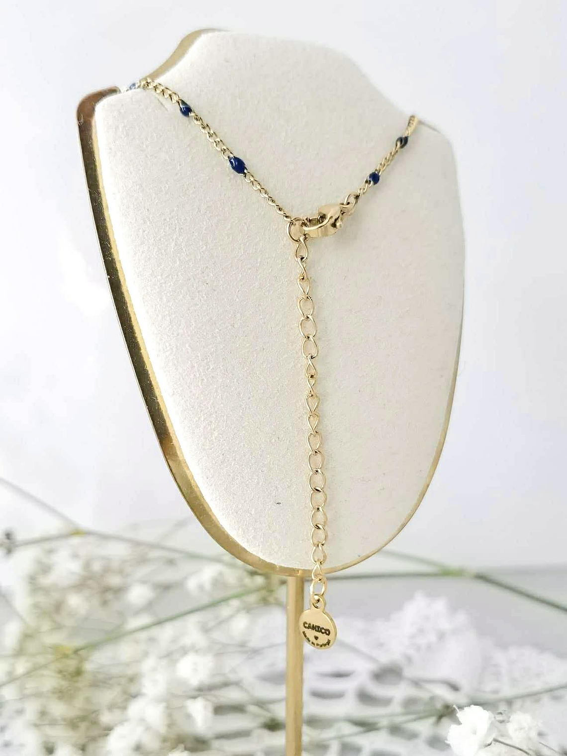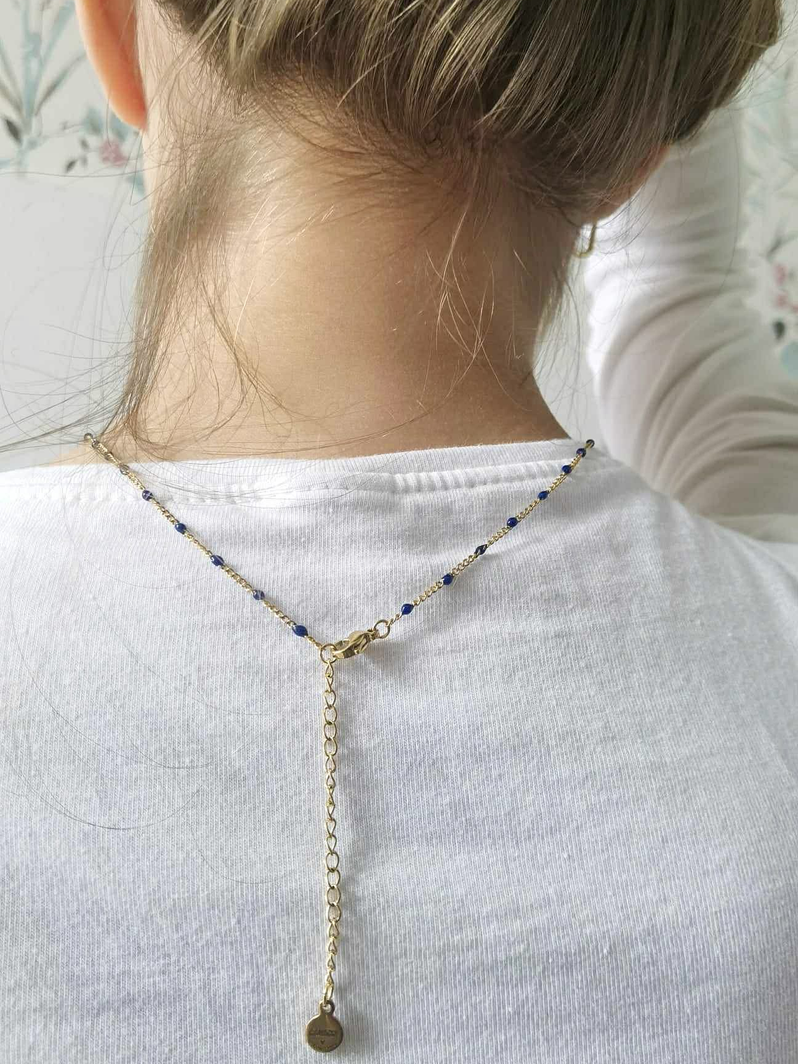 A corrente em aço inoxidável, de 45 cm (+ 10 cm de extensão), é anti-alérgica e sem níquel, pensada para um uso confortável e duradouro.