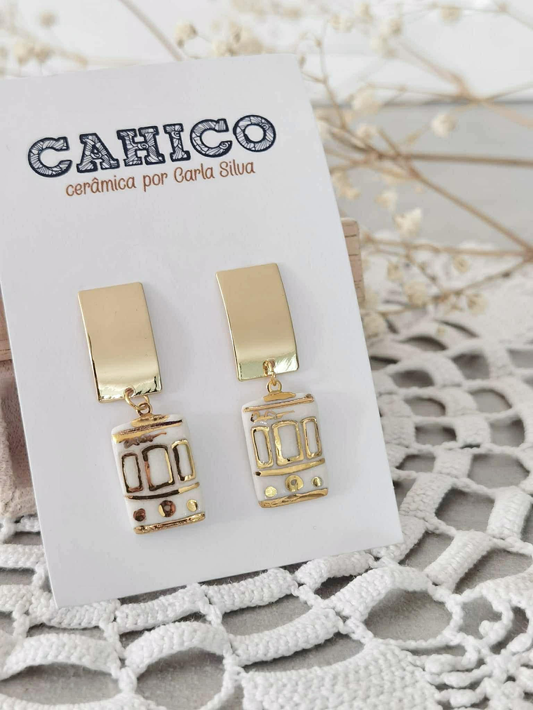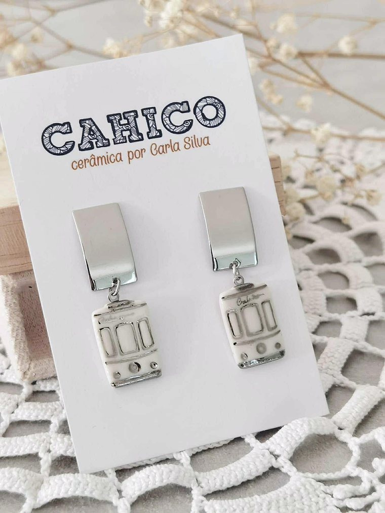 Um delicado rectângulo de porcelana feita à mão, com 16mm de comprimento e 10mm de largura, estampado com um padrão inspirado nos eléctricos portugueses.