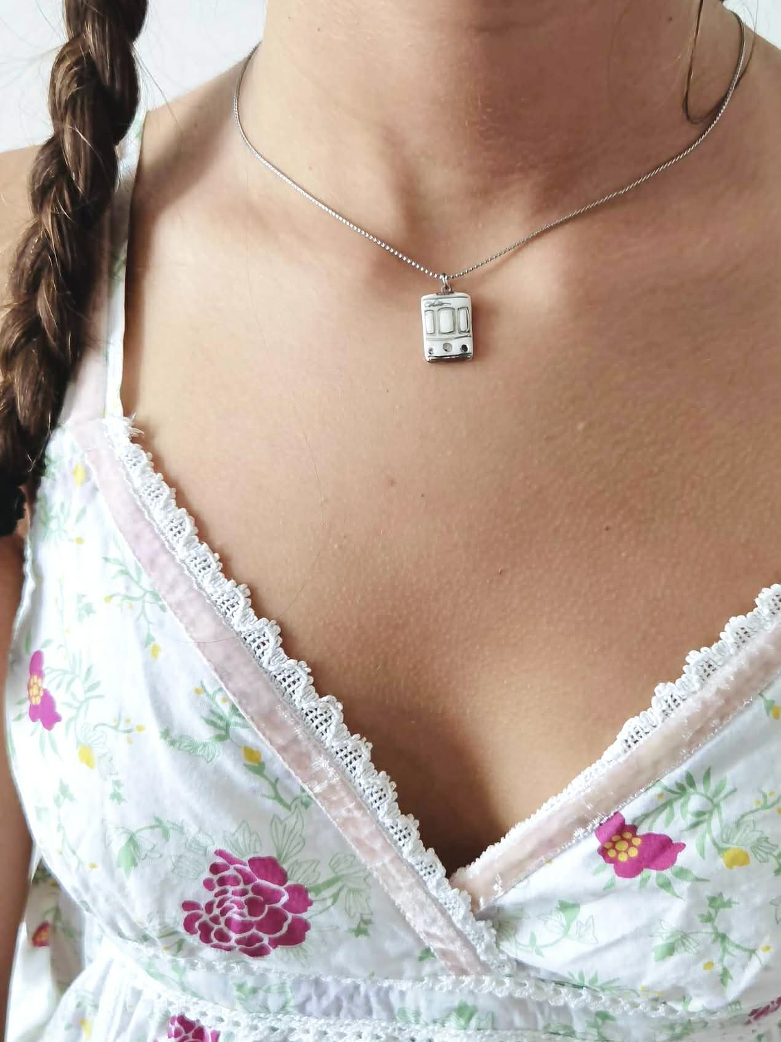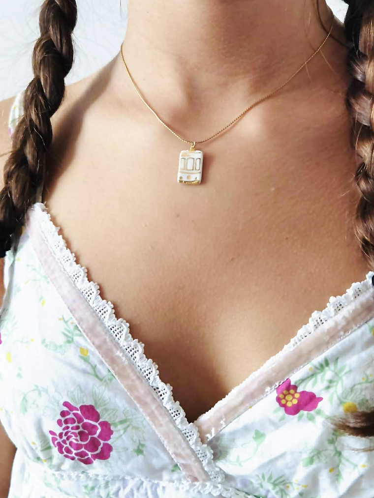 Um delicado rectângulo de porcelana feita à mão, com 16mm de comprimento e 10mm de largura, estampado com um padrão inspirado nos eléctricos portugueses.