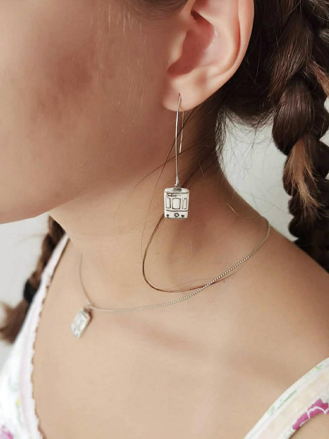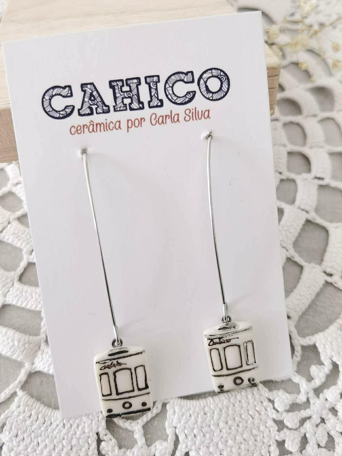 Um delicado rectângulo de porcelana feita à mão, com 16mm de comprimento e 10mm de largura, estampado com um padrão inspirado nos eléctricos portugueses.