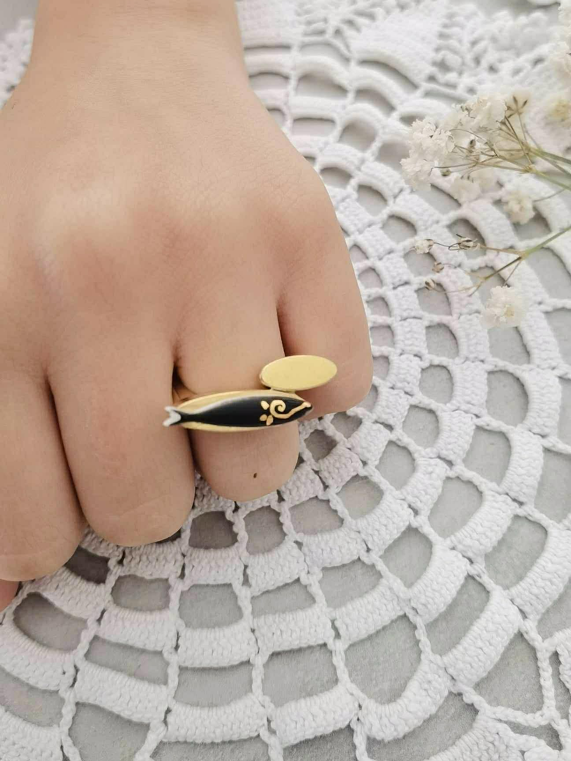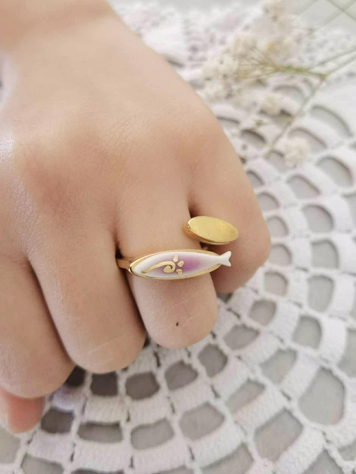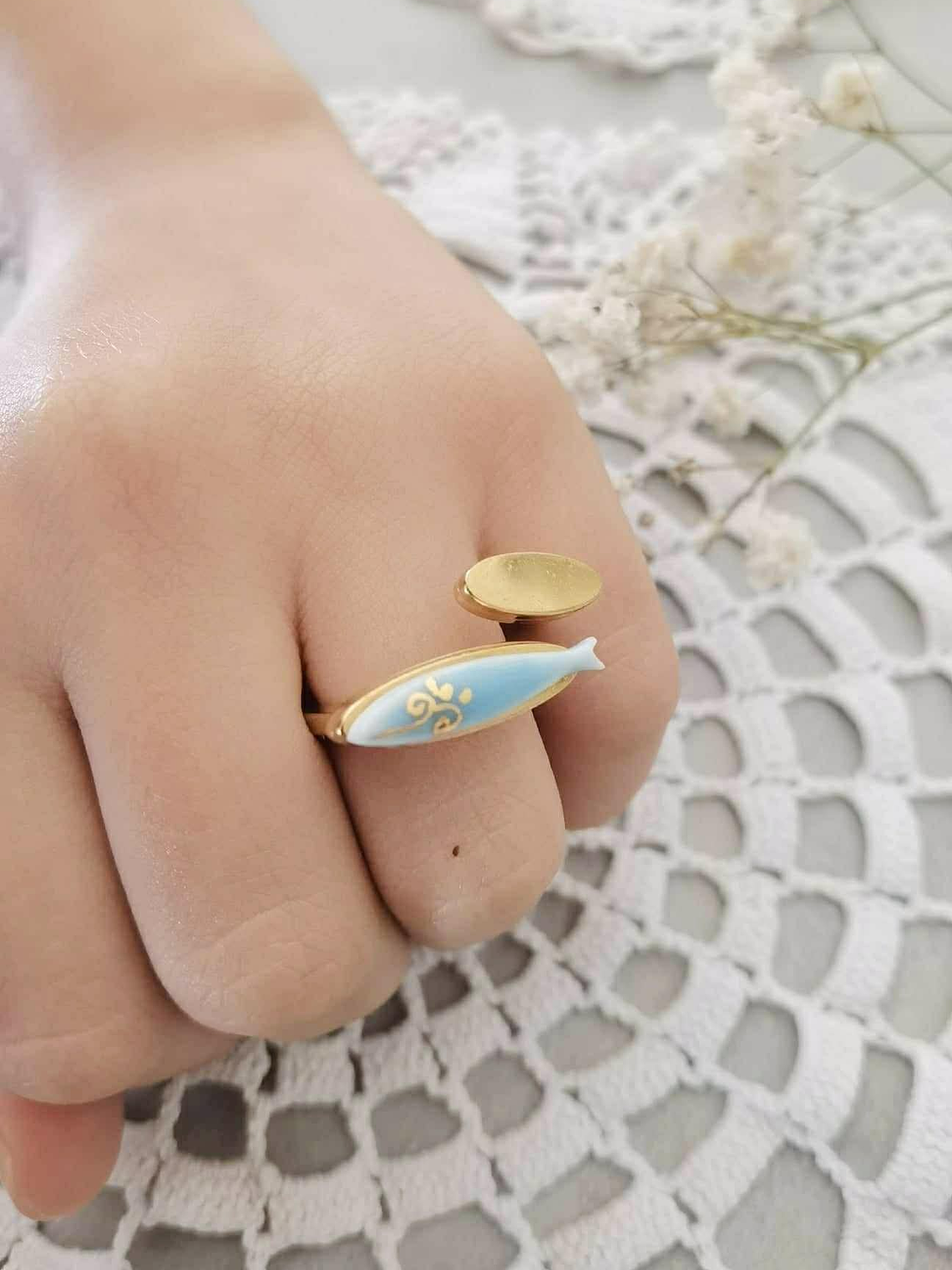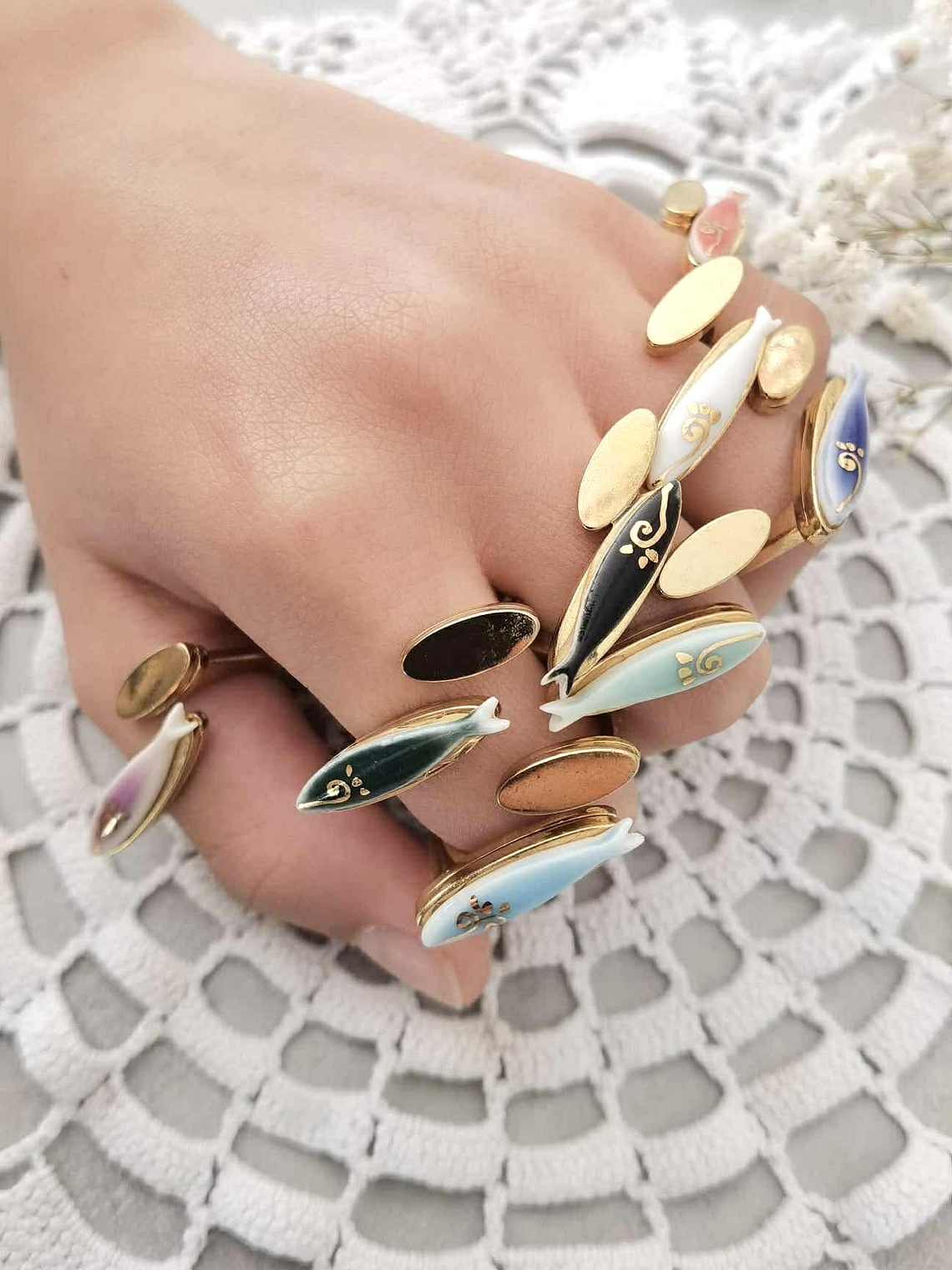 A base dos anéis é em aço inoxidável, anti-alérgico e sem níquel, garantindo conforto e durabilidade ao longo do dia e são ajustáveis.Peças que não brilham apenas pela cor — mas pela história que carregam.